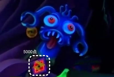 目が大きく、上の歯だけ4本出ていることが特徴のモンスターの首元に5000点があります。上下に動き、下に動いたときには狙えないのでタイミングが難しいです。